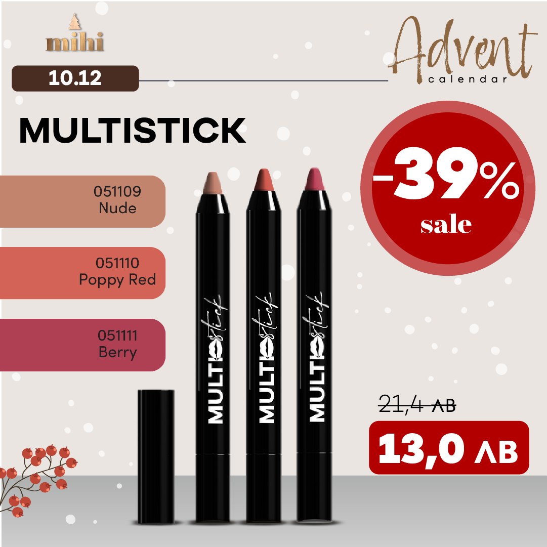 Мултистикът е многофункционален вълшебен инструмент за устни, очи и бузи, който ви осигурява свеж и естествен вид! 💄 Използвайте го като червило за меки и деликатни устни, кремообразни сенки за очи, за да подчертаете погледа си, руж за свежо излъчване, бронзант или леко контуриране.