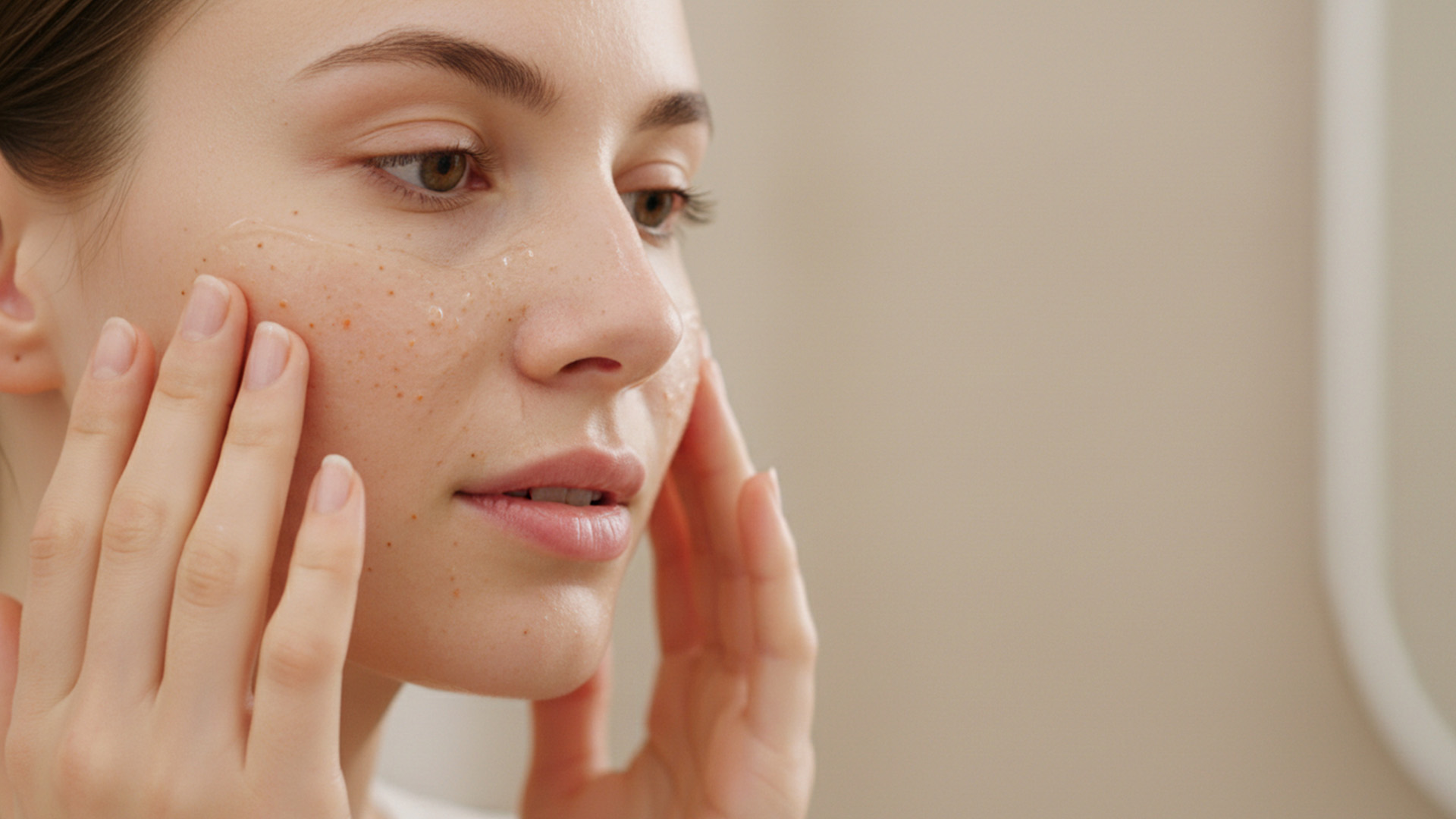 - Appliquer une petite quantité de peeling sur la peau humide du visage, en évitant le contour des yeux.