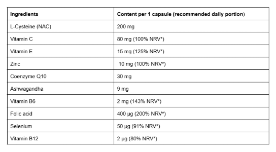 - Contiene el aminoácido N-acetil L-cisteína (NAC), vitamina C, vitamina E, citrato de zinc, coenzima Q10, ashwagandha, vitamina B6, ácido fólico, selenio y vitamina B12.
