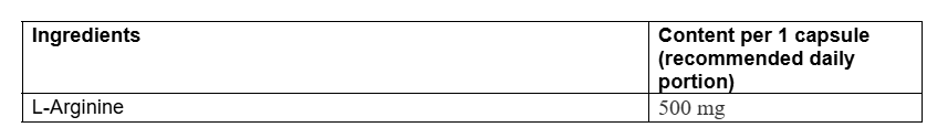 L-arginina; hydroksypropylometyloceluloza; substancja wypełniająca - celuloza mikrokrystaliczna; substancje przeciwzbrylające - sole magnezowe kwasów tłuszczowych i dwutlenek krzemu.
