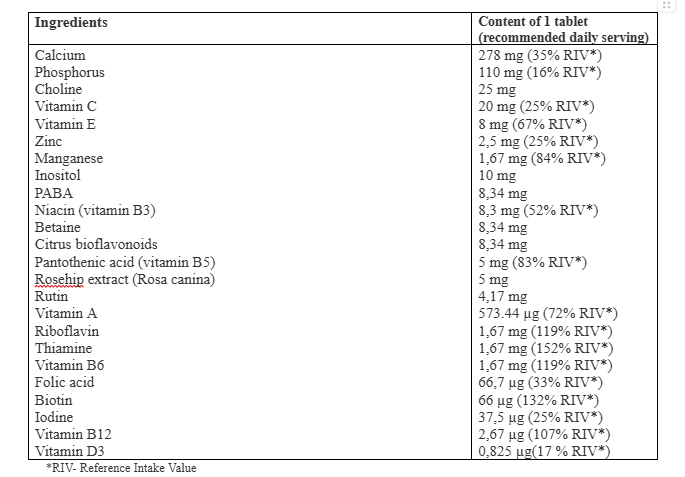Fosforan dwuwapniowy; węglan wapnia; substancja wypełniająca: celuloza mikrokrystaliczna; dwuwinian choliny; tlenek magnezu; kwas L-askorbinowy; glukonian cynku; octan DL-alfa-tokoferylu; glukonian manganu; substancja glazurująca: alkohol poliwinylowy; substancje przeciwzbrylające: sole magnezowe kwasów tłuszczowych i dwutlenek krzemu; inozytol; kwas para-aminobenzoesowy (PABA); niacynamid; chlorowodorek betainy; ekstrakt z nasion Citrus aurantium (bioflawonoidy); pantotenian D-wapnia; ekstrakt z owoców Rosa canina (owoc dzikiej róży); ekstrakt z kwiatu Sophora japonica (rutyna); fumaran żelaza (II); octan retinylu; ryboflawina; chlorowodorek tiaminy; chlorowodorek pirydoksyny; L-selenometionina; cholekalcyferol; kwas pteroilomonoglutaminowy (kwas foliowy); D-biotyna; jodek potasu; cyjanokobalamina.